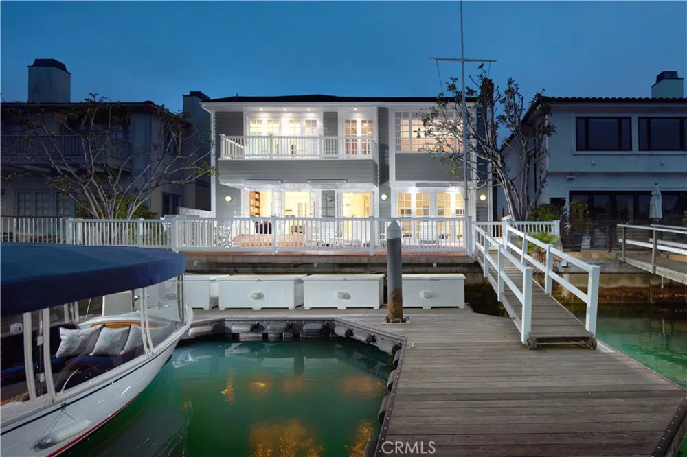 Experience the quintessential waterfront lifestyle you have dreamed of at this luxurious Newport Beach home on Harbor Island Drive. Nestled at the edge of Promontory Bay, the spacious five-bedroom, four-bath residence presents water views from both levels and its large backyard patio, which spans 50' of bay frontage and leads to a private dock with three slips, featuring a premium Brazilian hardwood surface. Handsome brickwork complements the front yard, where custom double doors introduce a light and airy setting with upscale nautical aesthetic. A two-story foyer makes a dramatic first impression and offers passage to an office/fifth bedroom on the main floor with extensive built-ins, bamboo flooring, and a tray ceiling. Yacht vibes are enjoyed in the bonus room, complete with access to a private brick courtyard, vaulted and beamed ceiling, porthole windows, lacquered wood floors, slate-surround fireplace, and a walk-in bar with Scotsman ice maker and refrigerator. Polished stone floors lead the way beyond the courtyard to a formal dining room with private side patio, and a wide-open living room and family room space with bay views and multiple French doors leading to the bayfront patio. A sleek stainless-steel-trimmed fireplace warms the living room, and the family room features a built-in entertainment center with surround sound. Classic white cabinetry and granite countertops with full backsplash lend an air of upscale refinement to the kitchen, where an oversized island with prep sink, access to the dining room, and stainless steel appliances are proudly displayed. High-end patterned carpet distinguishes second-floor areas including one private en suite bedroom and two bedrooms that share a bath. Overlooking the bay, the primary suite is appropriately grand. Enjoy a handsome fireplace, grasscloth wallpaper, sitting area, view balcony, walk-in closet with custom built-ins, two sinks, a jetted tub and separate shower. Millwork including crown molding is showcased, and a two-car garage includes built-in storage.